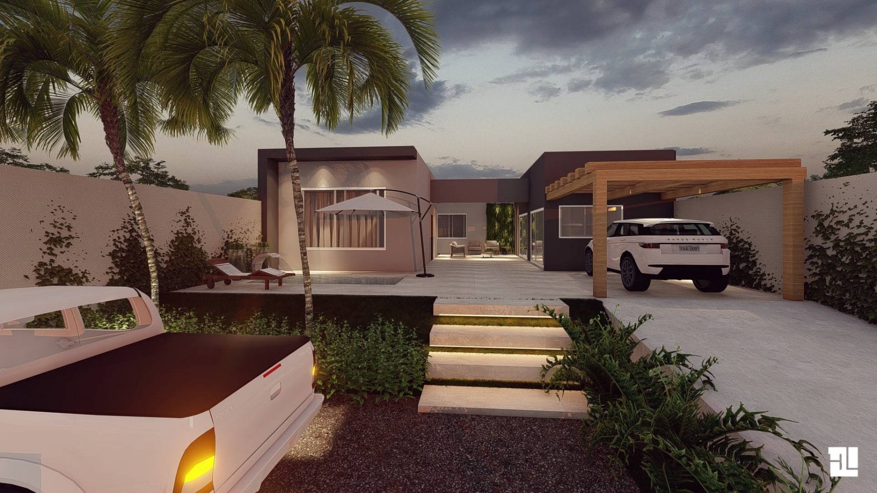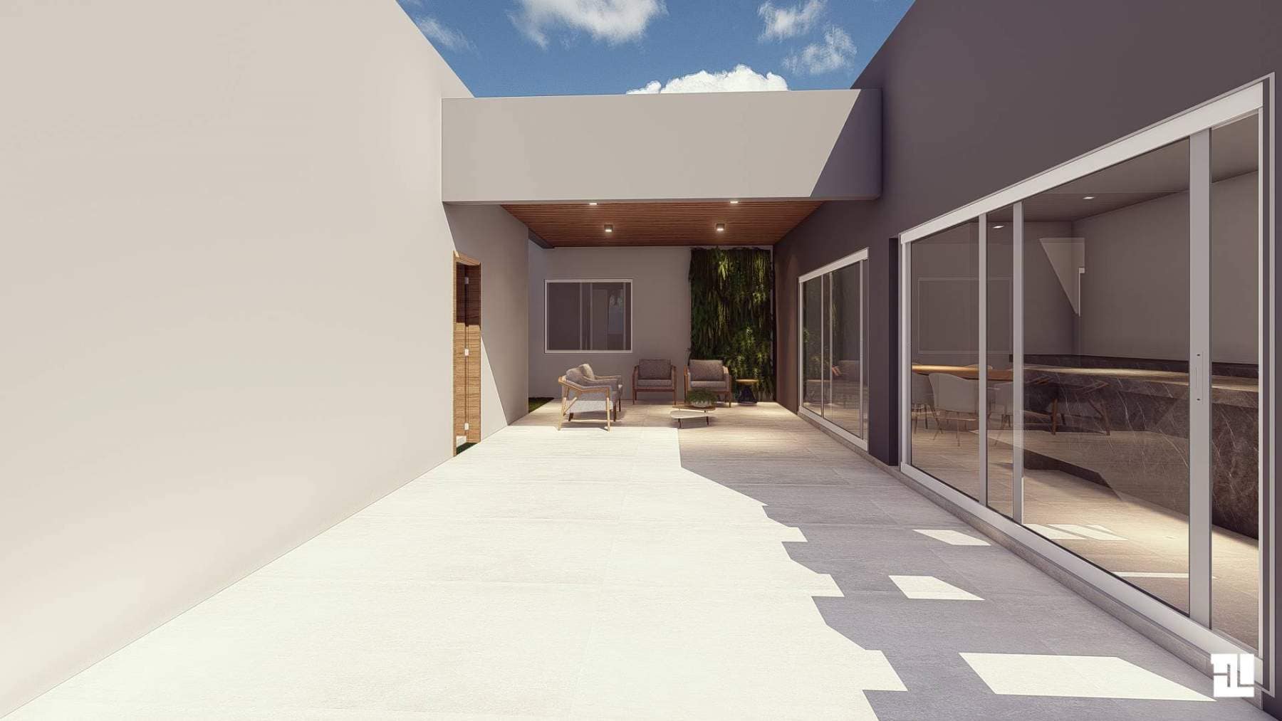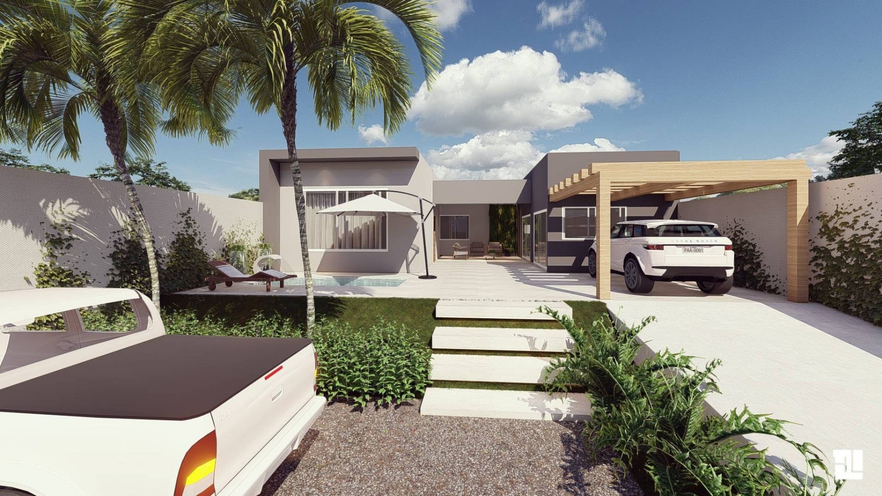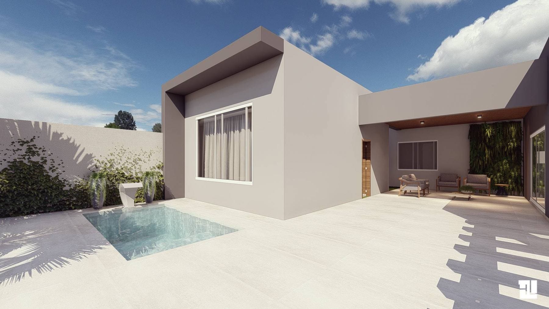 O estilo geral da fachada é elegante e moderno. Os materiais simples e as linhas limpas criam uma aparência elegante e sofisticada. A piscina e o deck de madeira adicionam um toque de diversão e descontração, e o espaço para conversar e relaxar oferece um lugar para se reunir com amigos e familiares. O estacionamento coberto garante que os carros estejam protegidos do tempo, e o design minimalista do edifício permite que ele se integre perfeitamente à paisagem.