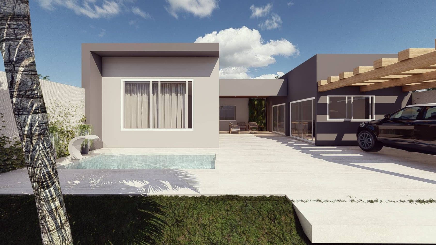 A fachada da residência é feita de materiais simples, como concreto e vidro. As linhas são limpas e elegantes, e o design é minimalista. A piscina é localizada no canto esquerdo da fachada, e é cercada por um mármore. Se tornando o lugar perfeito para relaxar e tomar sol, e pode ser usado para festas e eventos. Há também um espaço para conversar e relaxar na fachada, localizado em seu centro, mais adentro. Este espaço é perfeito para conversar com amigos e familiares, ou simplesmente relaxar e desfrutar da paisagem. O edifício também tem um estacionamento para carros, localizado na parte direita da fachada. O estacionamento é coberto, para proteger os carros do sol e da chuva.