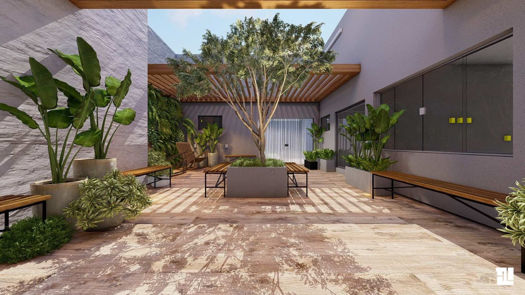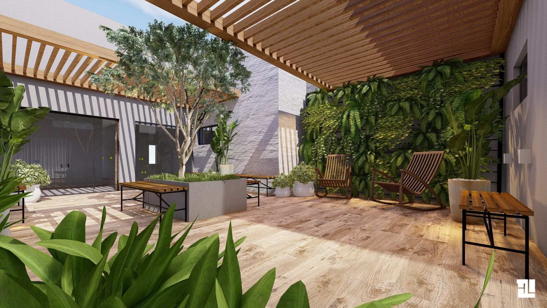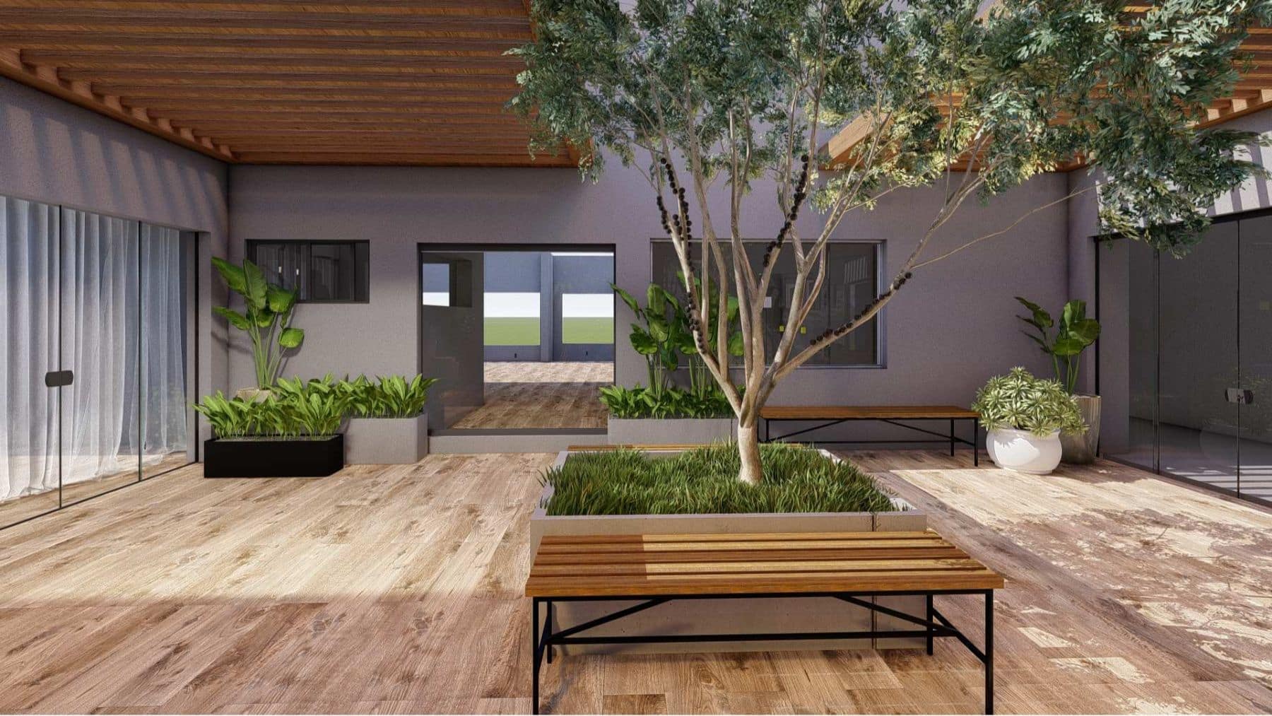Nosso escritório de arquitetura tem o prazer de apresentar um projeto arquitetônico para uma área de convivência destinada aos pacientes do hospital. Com um foco especial na criação de um ambiente tranquilo e rejuvenescedor, o projeto busca trazer a natureza para o espaço interno do hospital, utilizando uma combinação de vegetação exuberante e elementos de madeira que evocam uma sensação de calmaria.