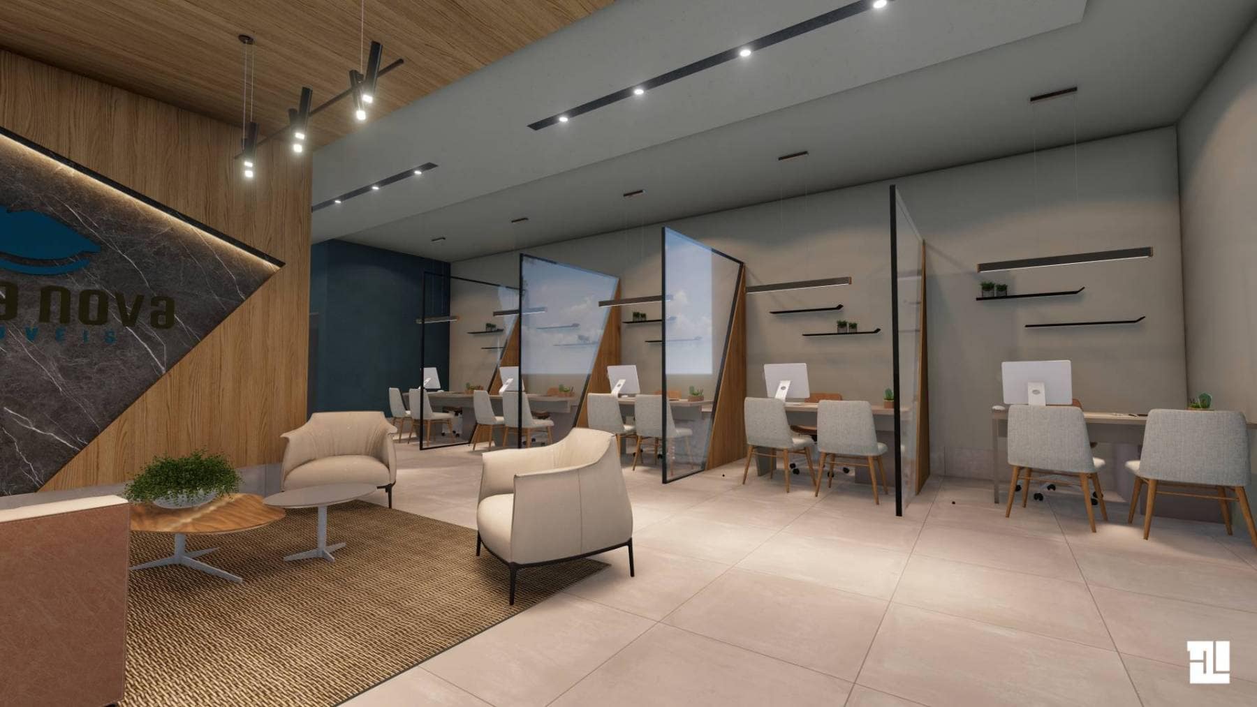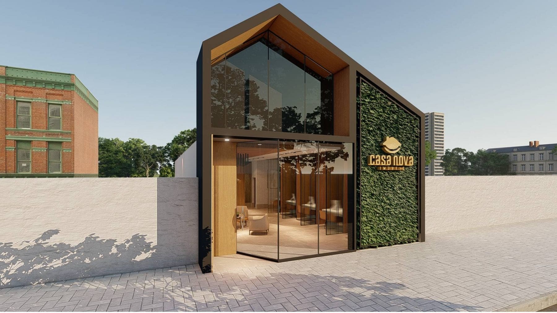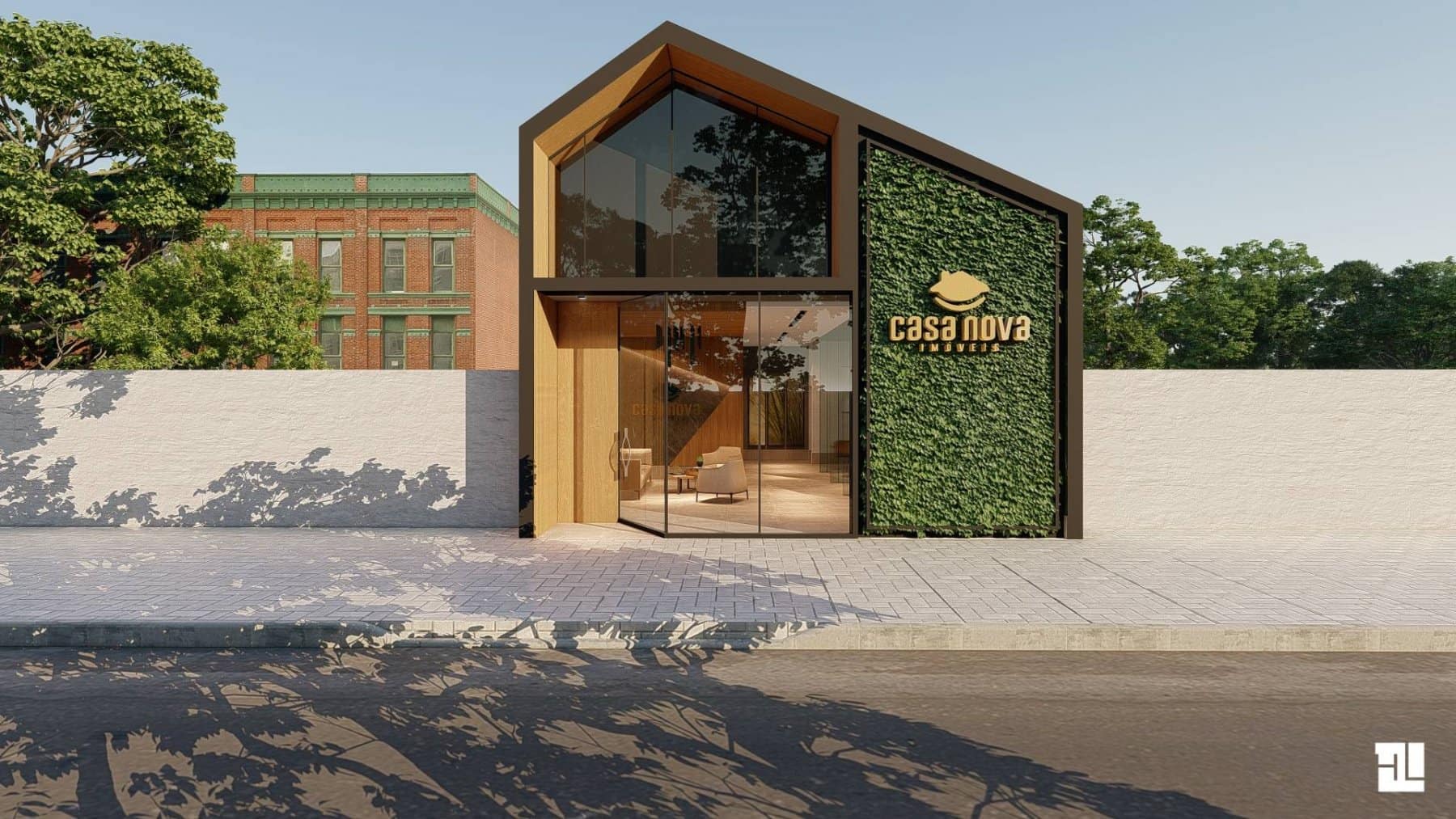 O projeto arquitetônico para o escritório imobiliário apresenta uma fachada convidativa e acolhedora, com um layout inspirado em uma casa. O espaço interno é cuidadosamente projetado, proporcionando um ambiente de conversação confortável e cabines de trabalho privadas para os funcionários.