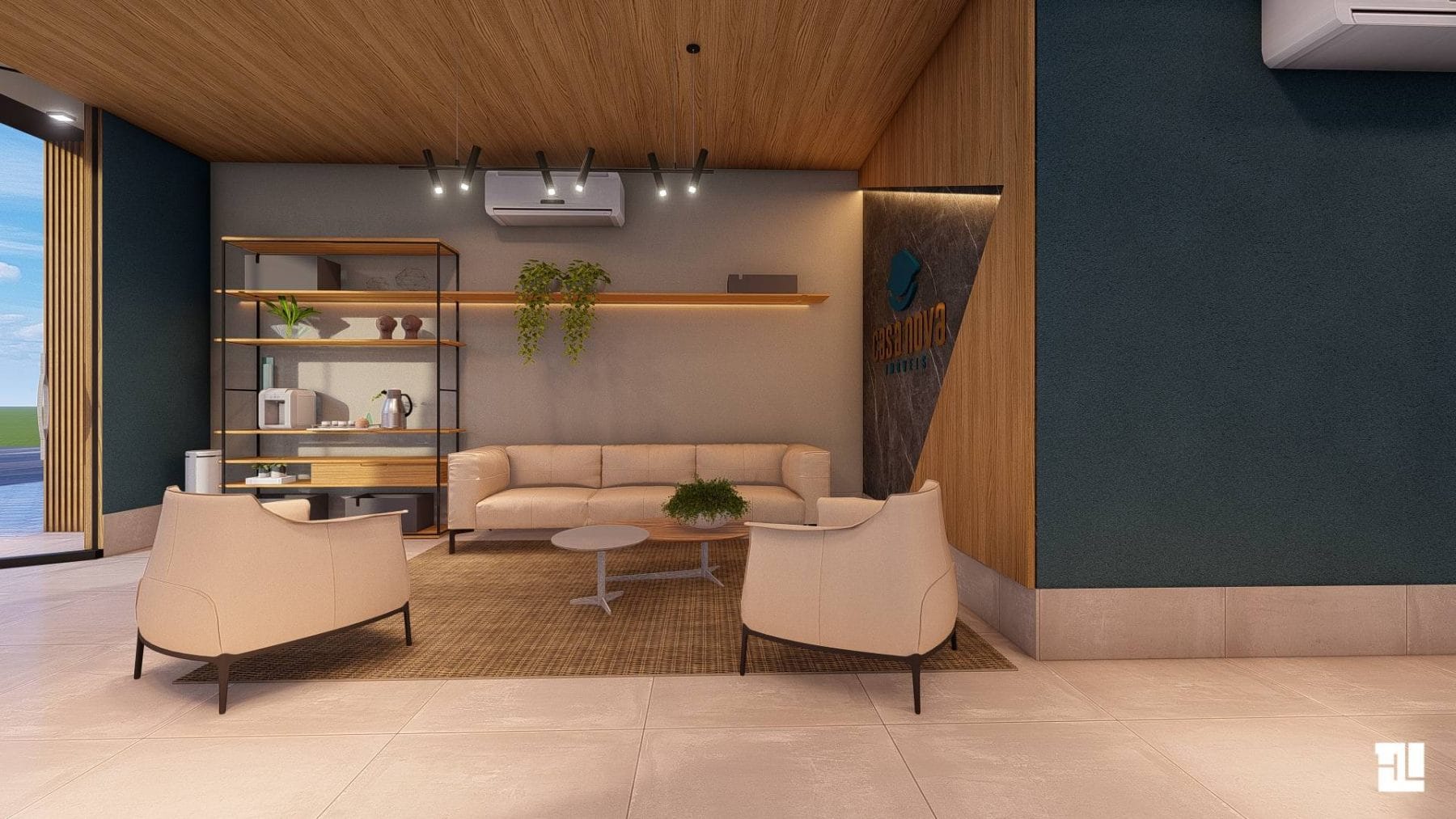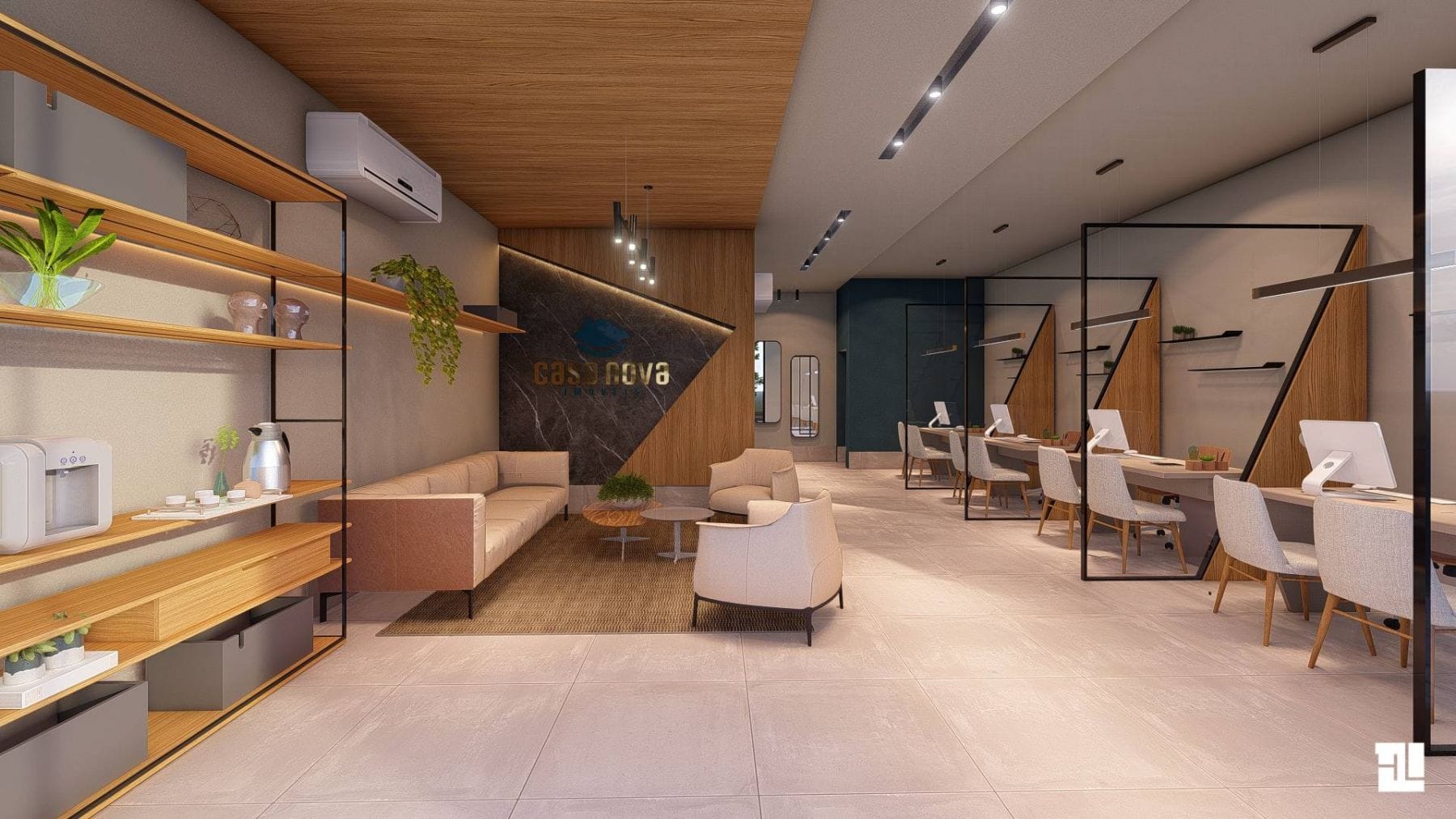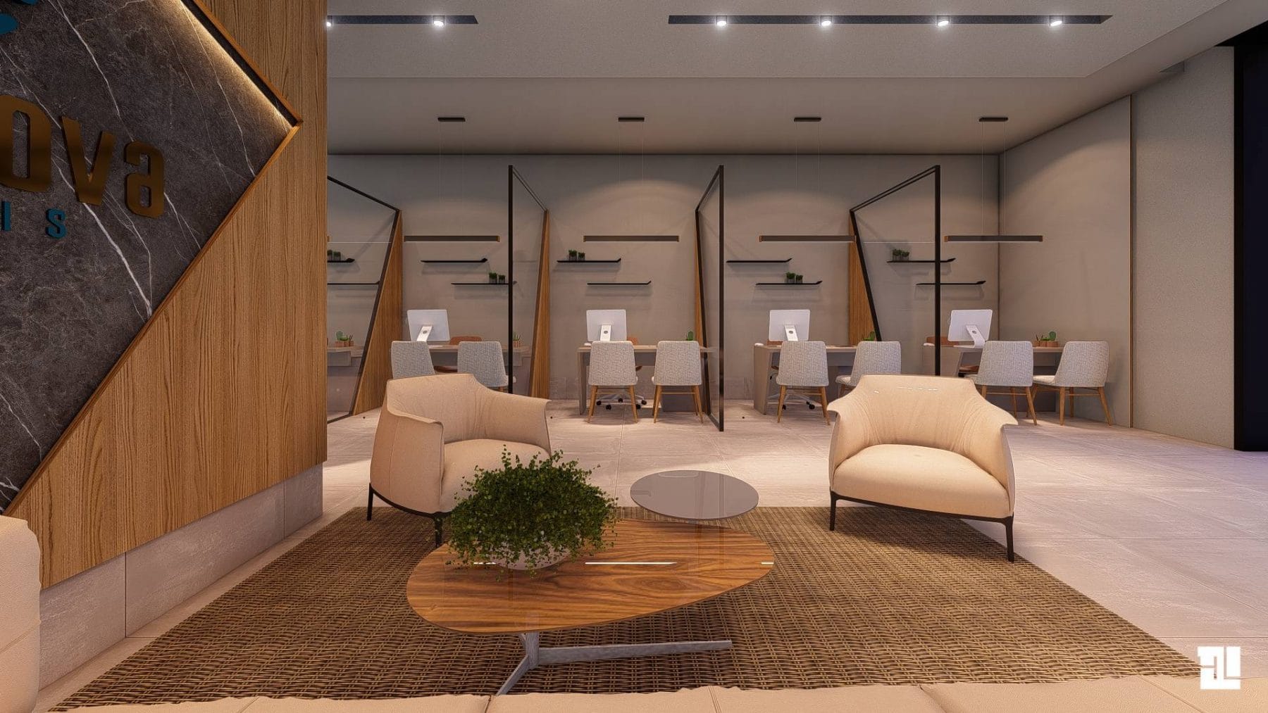 A combinação de elementos naturais, como madeira e plantas, com elementos contemporâneos de design cria um ambiente esteticamente agradável, refletindo a proposta da empresa e transmitindo uma sensação de profissionalismo e conforto para os visitantes e funcionários.